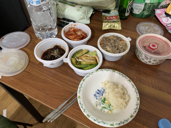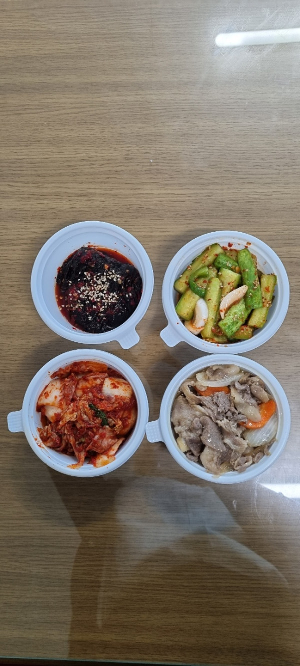 <배추김치, 오이무침, 돼지불고기, 깻잎지>입니다.
