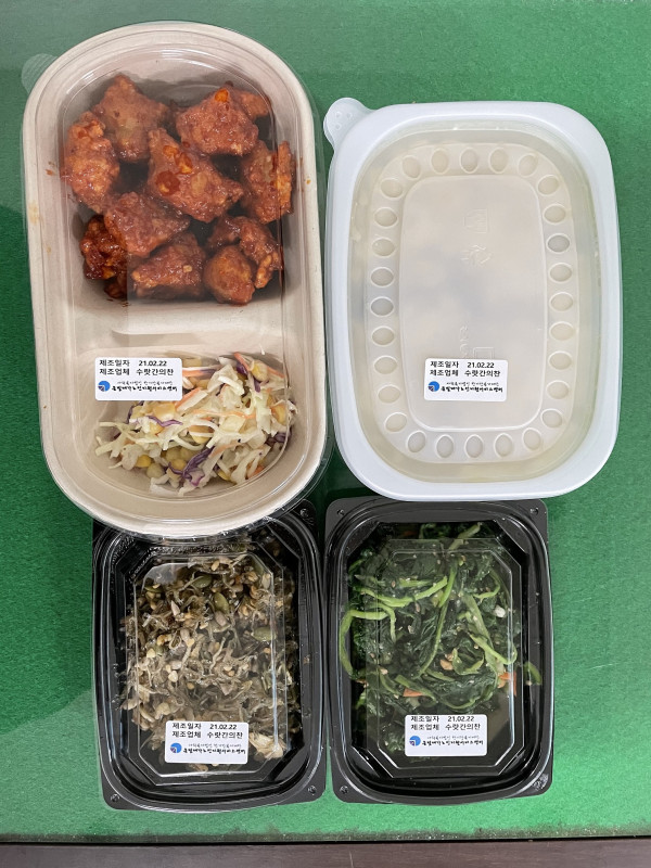 <닭강정, 견과류멸치볶음, 유채나물, 소고기국>입니다.